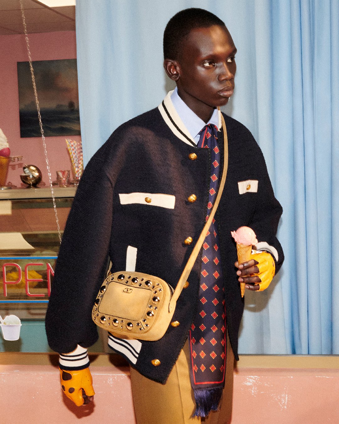 The preppy style is reimagined through a modern lens, echoing the refined yet relaxed attitude. Blazers with contrast trims, varsity-inspired bombers, striped knits, and classic polos are elevated with embroidered patches and archival logos from the Maison’s heritage.